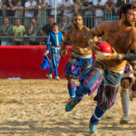 Calcio Storico Fiorentino is a Renaissance Football game first played in Florence (Fiorentina), Tuscany in the 1400s by workers on breaks from work in the city. It was the first organised football in the world, rather than the Medieval mob football which preceeded it and where there were no rules or restrictions on numbers playing. It could be seen as part of the wider Renaissance whereby Tuscany’s ancient pre-Roman, pre-Catholic past was brought back. It is 27-a-side and played on sand in the Piazza di Santa Croce